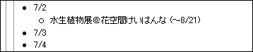 取り敢えず左の画像を参考に説明を。日付と催し物はセット、日付はその催し物が始まる日で、最後につく括弧が開催される期間となっています。催し物の方が見ての通り下がっております。