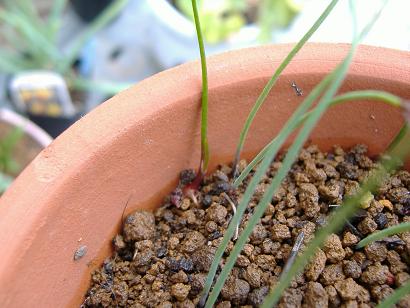 写真手前はチューリップの発芽した物、中央の奥に見える濃い緑色をしているものがこの種の種子より発芽した個体です。条件さえ整えばこぼれ種でも発芽するようで、分球も含めて非常に旺盛に繁殖します。